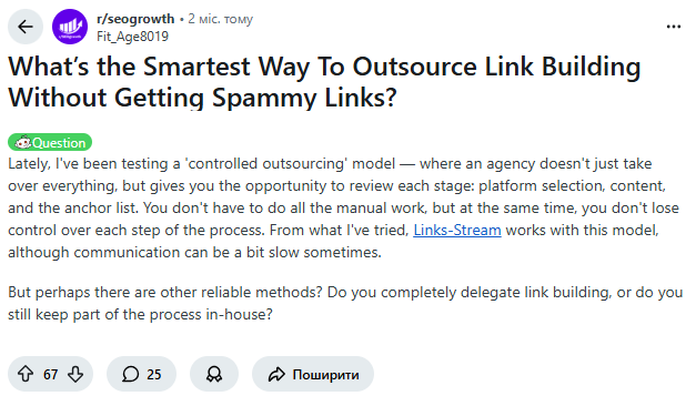 We didn’t try to reinvent the wheel or build a complex manipulative setup. Everything was much simpler and more pragmatic. Like our competitors, we understand the value of visibility in “TOP”, “BEST”, and similar discussion feeds. So we launched a thread in r/seogrowth with a practical question: how to outsource link building intelligently.