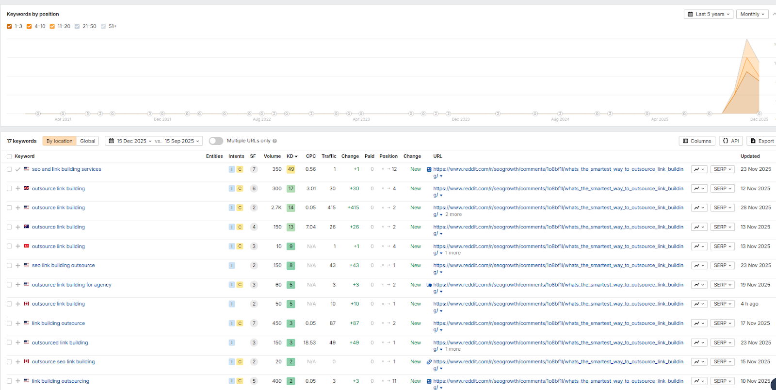 Overall, the thread reached TOP-10 positions in Google for high-volume commercial queries, including outsource link building and link building outsourcing.
